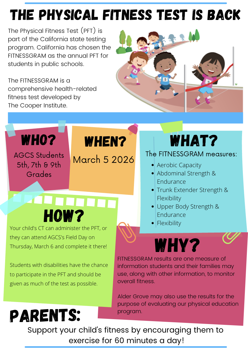 Each year, California public schools use the FITNESSGRAM® for their Physical Fitness Test (PFT). Grades five, seven, and nine are expected to participate. The main goal of the test is to help students reinforce or learn about life-long healthy activity habits. The test assesses the following five fitness areas:
